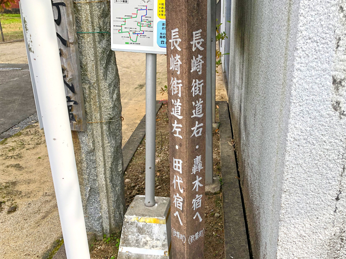 宿場に入ると、「町本陣」を示す標識が左にある。脇本陣のことで、伊能忠敬一行も本陣とし、プチャーチンとの交渉で長崎に向かった川路聖謨(かわじとしあきら)も利用したらしい。この通りは旅籠街で、その先の三叉路に「高札」、向かいに「問屋場(現・久光製薬)」の標識が見える。右折し左側に、「上使屋(御茶屋)」、「代官所(現・田代小学校)」、「線刻恵比須」が並んでいた。この界隈が町の中心で、普段は本町(上町と下町)と呼ばれていたという。