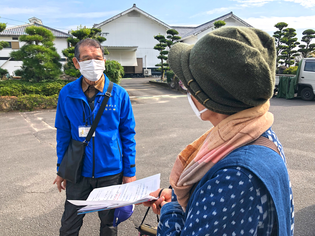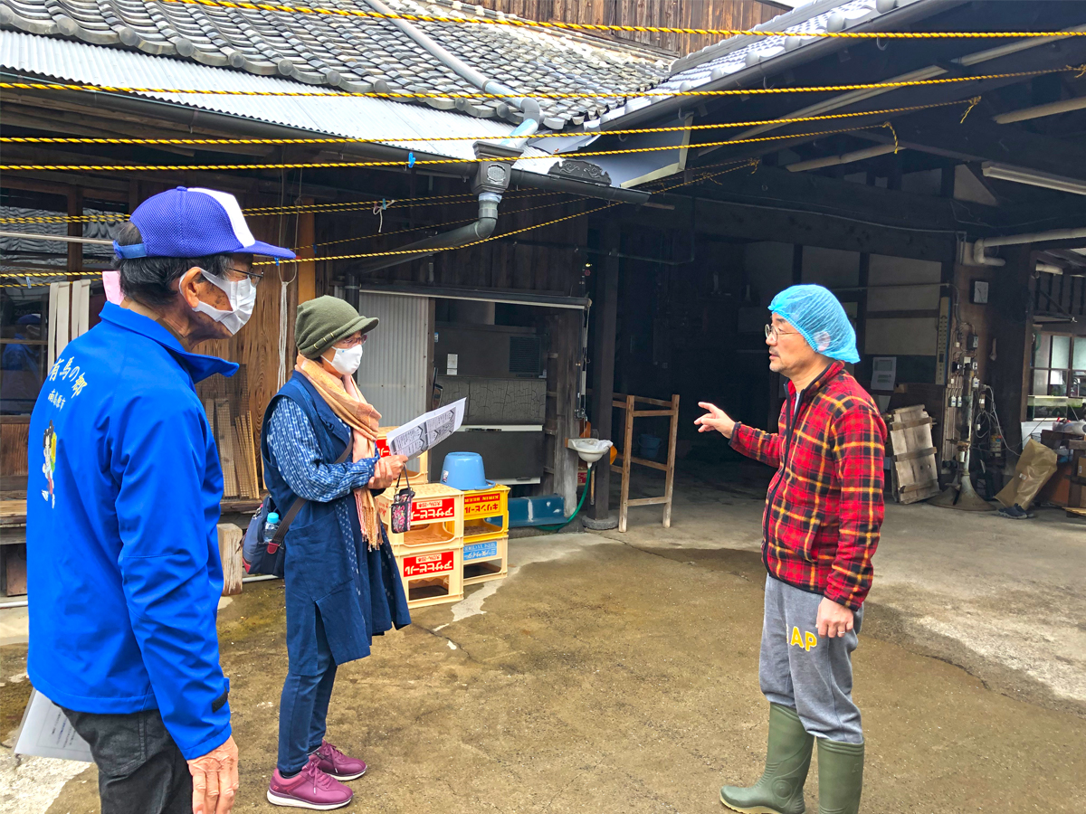古くから味噌・しょうゆ醸造業をしている会社。ここも座敷があり、会社側に時間があるときには、お客様を上げてお茶を出しているとのこと。この日も対応していただき、こちらの味噌は麦味噌で、魚との相性が特によく、あらかぶ(カサゴ)のみそ汁は最高だそうだ。海が近く、新鮮な魚を出汁にしていただくみそ汁は聞いているだけで美味しさが伝わる。熊本から天草へ橋を使ってわたることができるまでは、天草への出荷量は多く、今ある倉庫は、戦後すぐに天草から小学校の講堂を移築しているものだそうだ。柱がなく、倉庫としての利用価値はもちろん、趣もある。