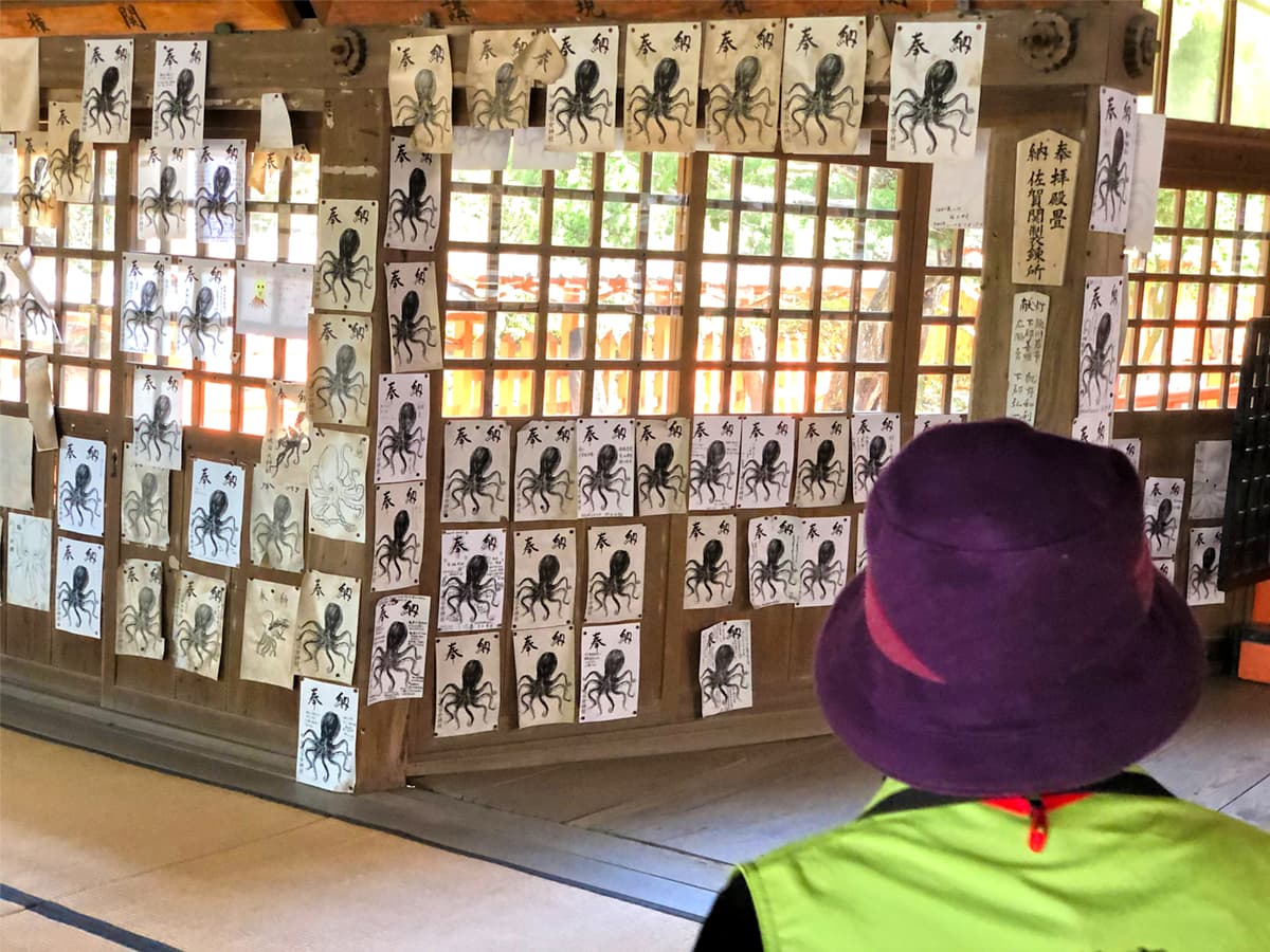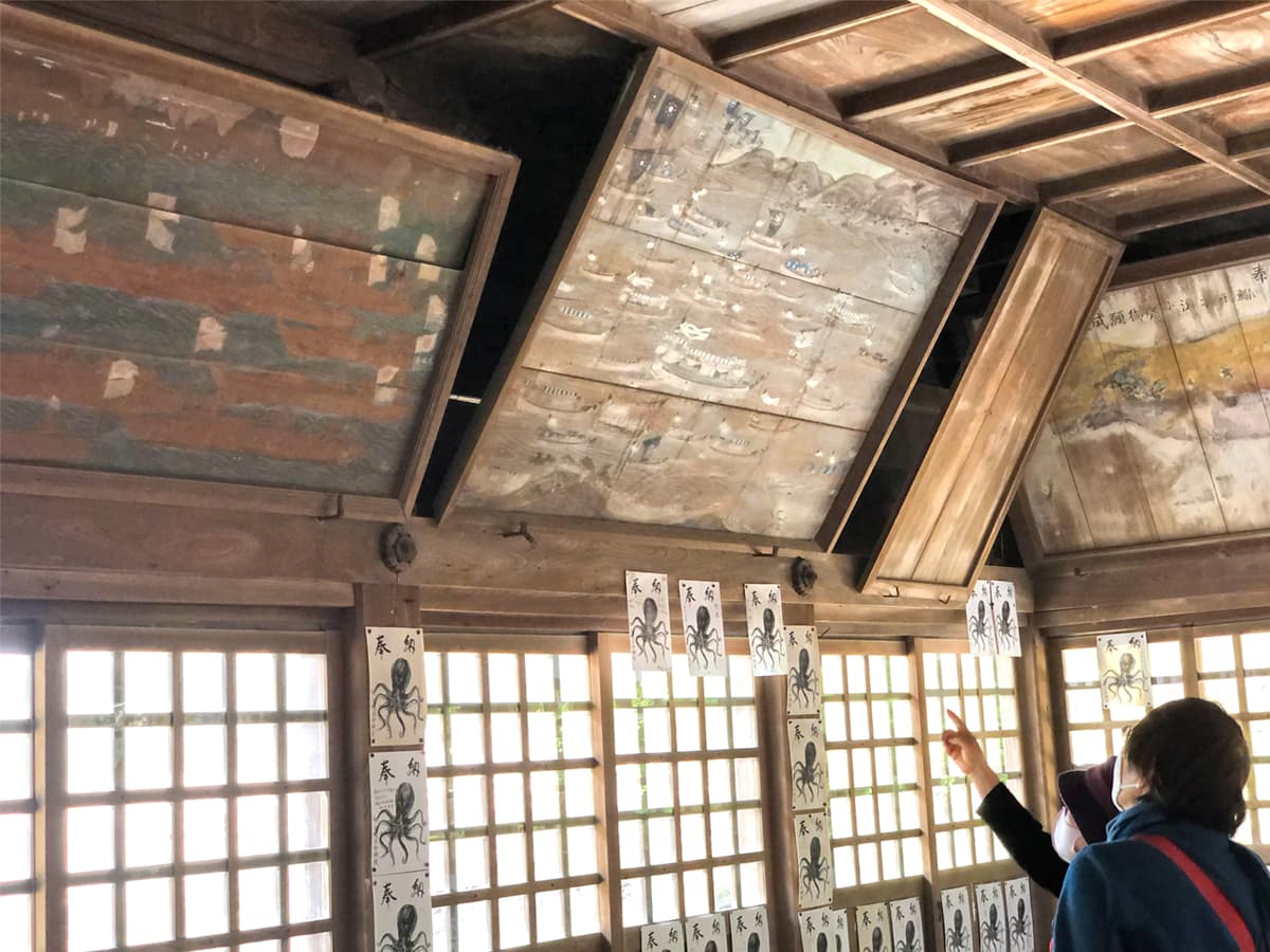 拝殿の中に入ると、蛸絶ち祈願のお札がたくさん貼られている。これは、蛸が神様になっていて、「願いを叶えてください」と言い、蛸を食べないでご祈願することで願いが叶うそうだ。天井絵もすごいが、残念ながら風化がひどくなっている。