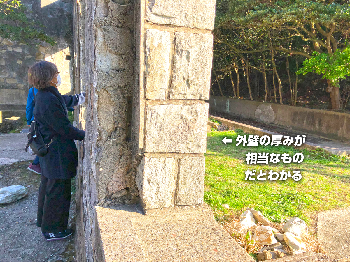 空気圧縮喞筒所は、魚雷をトロッコで運び込み、油と空気をエンジンの中に詰め込む作業を行っていたそうだ。ここで試験を行っていた九一式という魚雷は、昭和7~8年に造られたもの(皇紀2591年に造られたところから命名されている。皇紀とは、神武天皇即位年から数えられていて、元年は西暦前660年)で、大正6年(1917)の建築当初とは違い、大きなコンプレッサーが必要になり、機械を中に入れるために、天井を高くしたそうだ。そのため、当初の壁と比較して、上の方は壁厚が薄い。魚雷は、1.5~2km先をめがけて、発射させるため、相当な精度を要求されていたように思う。コンプレッサーを動かすと熱を発するので、冷やす必要があり、横の大きな25mのプールに、水を溜めて使っていたそうだ。発射試験をした後、魚雷は海水にまみれているので、真水で洗ったり、点検整備もおこなっていたとのこと。昭和18年(1943)には、川棚海軍廠工場から魚雷が運び込まれていたそうだ。魚雷の燃料は灯油で、燃料倉庫として利用されていた石組み倉庫がプールの横に見受けられる。工場の横には、小高い山があり、標高54mで、魚雷がまっすぐ行ったかどうかの確認をするための観測所があったとのこと。