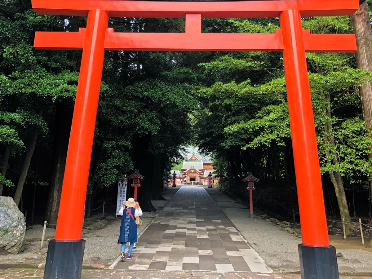 緑がとても映えてきれいだが、秋の紅葉の時期もとてもきれいだそうだ。奥に見える鳥居は三の鳥居で、その奥に本殿があるが、その先には高千穂峰が晴れていると見えるとのこと。