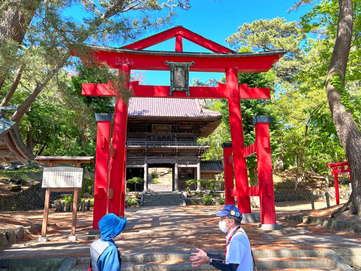 鳥居をくぐると立派な山門が現れる。明治27年の地震で倒壊したため、明治40年に再建されたものになる。山門の中で手をたたくと反響し、鳴き龍のように聞こえる。