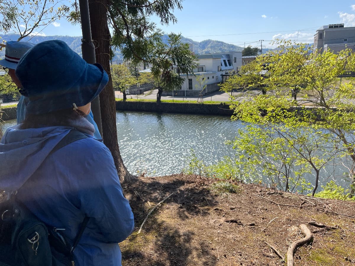 本丸から堀越しの対岸を見ると、本丸の高さが実感できる。土を盛り上げて土手にしてあったことがわかる。堀は当時のままで、幅は24~30mある。