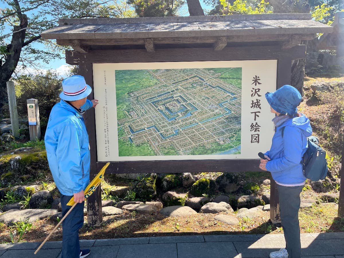 米沢城本丸跡になる松が岬(まつがさき)公園内には、上杉謙信公を祀っている上杉神社がある。江戸時代に入った1600年以降、上杉氏が国替えで会津若松から来た。米沢は鎌倉時代の大江広元が始まりで、長井に名前を変えて城を建て、堀らしいものを造り始めた。その後伊達氏が200年ほど治め、伊達政宗も24才までここで過ごした。その後蒲生氏郷(がもううじさと)氏が8年ほどいて、江戸時代を迎える。